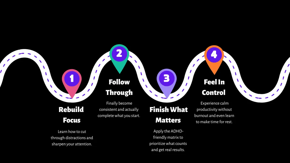 It’s a compassionate, science-backed system designed specifically for ADHD adults to reclaim focus and follow through, without burning out or forcing rigid routines.